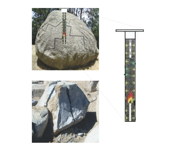 Al accionar la herramienta, esta activa el cartucho con propelente en el fondo del orificio barrenado en la roca, generando gases cuya presión es transferida a través de la columna de fluido como tensión mecánica que se libera con la fractura a la tracción de la roca.